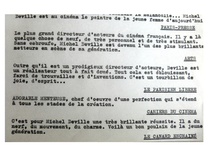 On observe ce bonheur des mots et de l’écriture jusque dans le matériel promotionnel, tel ce dossier de presse pour Péril en la demeure, qui comporte une filmographie malicieusement réinventée de Michel Deville.