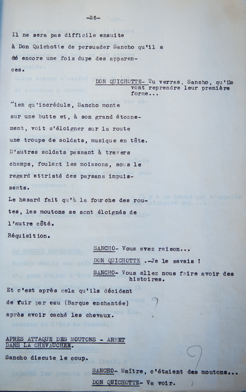 On y trouve également quelques indications de montage comme les fondus enchaînés, des références à certaines discussions qui n’apparaissent pas dans les dialogues. Sur la droite de chaque page sont notés les dialogues, l’ambiance sonore (« tintements de grelots »), les séquences des chants, mais aussi les références au texte de Cervantès, et enfin des explications quant au choix de la narration ou au sens de l’action. Ce texte est dactylographié et non signé, des annotations manuelles y ont été ajoutées, qui corrigent les dialogues, relèvent des contradictions dans la narration, ou sont de simples points d’interrogations qui laissent penser que leur auteur hésite à saisir la fonction de certains éléments de découpage. Il est difficile de savoir s’il s’agit de la version proposée à Pabst par les producteurs ou d’une version préliminaire de Paul Morand et Alexandre Arnoux, ni qui l’a annoté.