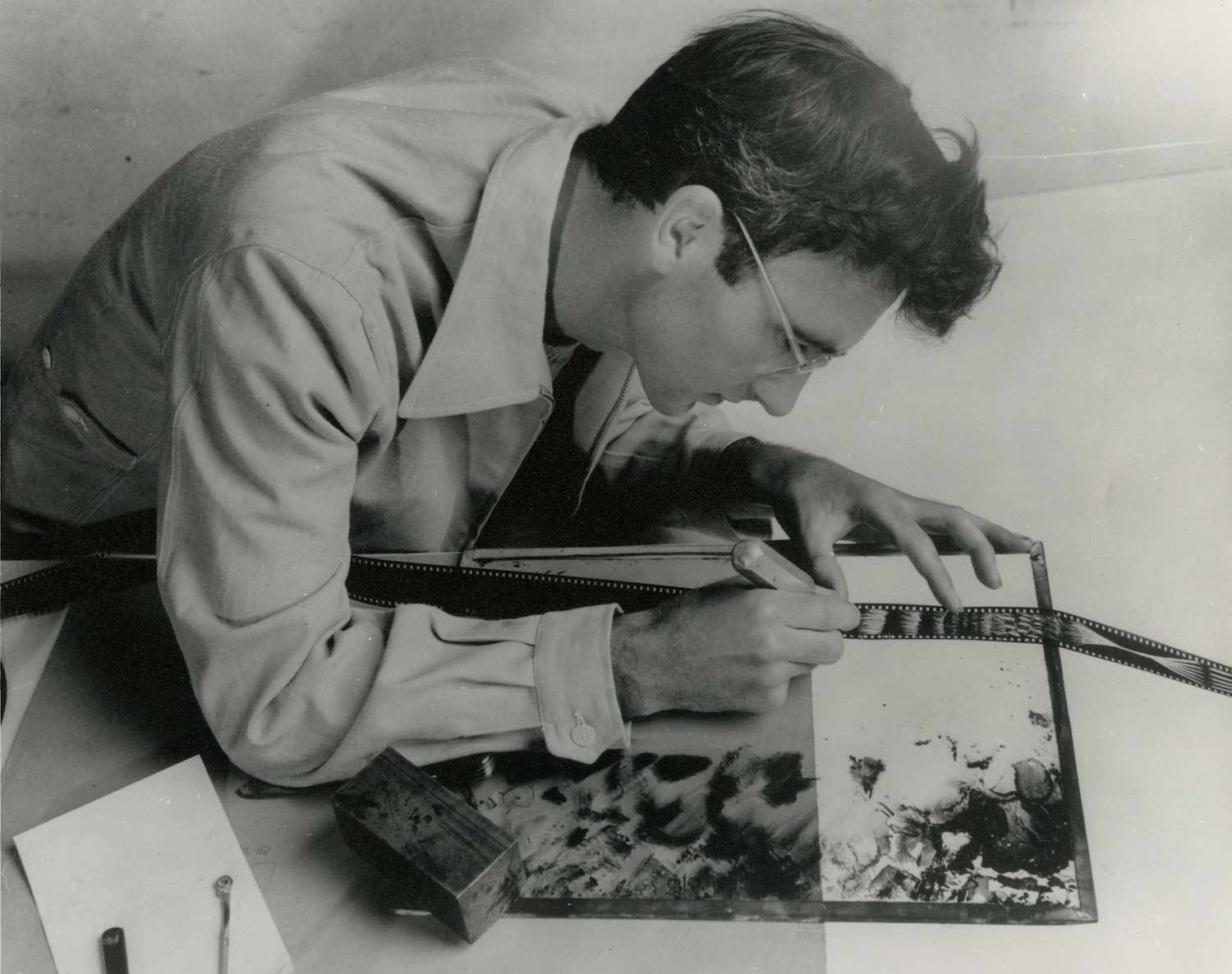 Norman McLaren et sa caméra Bell & Howell 35 mm transformée en tireuse, permettant de rephotographier des films peints, trop épais pour la projection, sur un support vierge