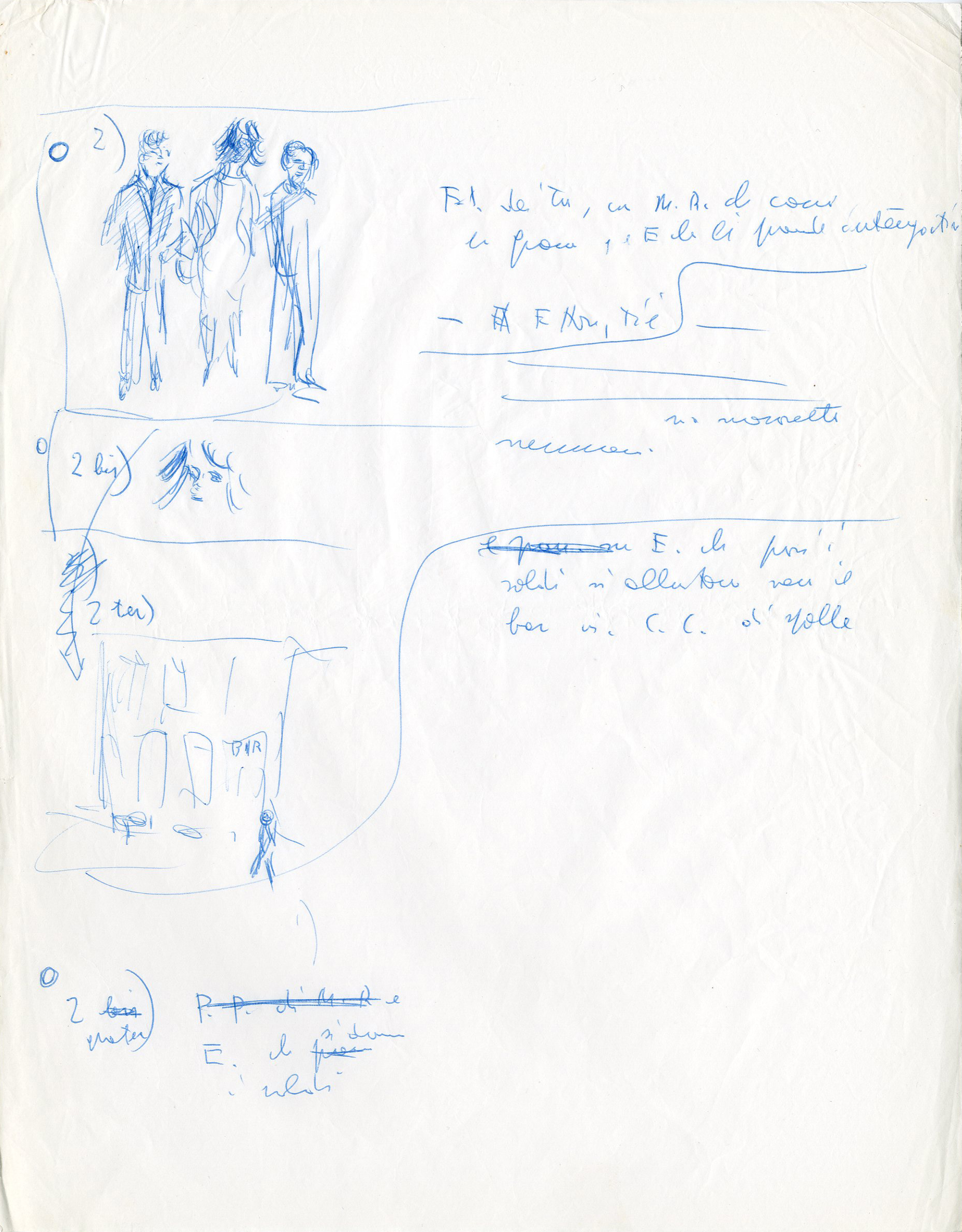 Se trouvent aussi conservées au Centro Studi – Archivio Pier Paolo Pasolini – Cineteca di Bologna les photocopies de 10 autres feuilles, correspondant aux scènes 3 (plans 8 à 23), 7 (plans 1 à 24), 12 (plans 8 à 12), 23 (plans 12 à 15), 52 (plans 1 à 7). Les originaux ont malheureusement été volés, de même que des feuilles données par Carlo di Carlo. Comme l’a montré Elena Frontaloni, ces fragments du découpage ont connu une réelle histoire éditoriale : certains dessins ont été publiés avec le scénario du film en 1962 (aux éditions milanaises Rizzoli), puis en 1987, d’autres, avec leurs didascalies, dans Une vie future (par l’Associazione Fondo Pasolini et Ente Autonomo Gestione Cinema), puis dans Le Regole di un illusione en 1991 (sous la direction de Laura Betti et Michele Gulinucci). Cependant, jamais aucune page n’a jusqu’ici été montrée dans son entier, et encore moins une séquence.