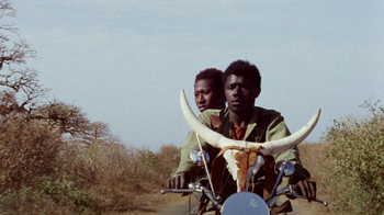 Chez Sembene, chez Ecaré, plus crûment encore chez Hondo, la culture occidentale est filmée comme une seconde peau, un masque difficile et pénible à porter, mais toujours susceptible d’être arraché à la faveur d’un retour au pays. Dans Touki Bouki, de Djibril Diop Mambéty, la question du départ et de l’exil occupe encore une place centrale en s’infléchissant. Le film suit les tribulations dakaroises de deux jeunes malfrats qui vivent moins dans le présent que dans l’attente du moment où ils pourront embarquer pour Paris (le leitmotiv musical du film est le « Paris, Paris, Paris… » de Joséphine Baker). Plutôt que d’ancrer son film dans une veine réaliste, Mambéty construit un complexe et chatoyant paysage spatio-temporel où se mêlent présent et futur, réalité et fantasme, ici (Dakar) et ailleurs (Paname), inventant des transitions d’une brutalité à couper le souffle, faisant entrer le cinéma africain (qui cela dit ne se risquera plus guère dans ces contrées) dans l’âge de la rupture et du chaos, mais aussi de la sensualité, du lyrisme et de la poésie.