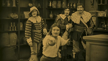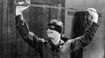 Au film, l’ancêtre du genre serait peut-être une production Pathé de L’Assassinat du duc de Guise qui connut plusieurs versions à partir de 1898. Déjà des capes, des épées, des perruques et des complots. Une volonté de reconstitution historique, mais le jeu quelque peu daté des acteurs fait dériver le film vers autre chose de moins sérieux. Jusqu’à ce que ce théâtre filmé un peu empesé cède la place à quelque chose de moins théâtral, de plus cinématographique… Et c’est là que Zorro arrive… En 1919 paraît dans un magazine populaire Le Fléau de Capistrano de l’écrivain américain Johnston McCulley qui crée là le personnage de Zorro. L’année suivante, l’acteur Douglas Fairbanks écrit, produit et interprète une adaptation, Le Masque de Zorro (réalisé par Fred Niblo) et met le genre à la mode. Le succès du film est triomphal et mondial. La personnalité et les goûts créatifs de Fairbanks, sa vitalité (« une des plus grandes choses dans ce monde est l’enthousiasme. » disait-il) définissent le genre. Dans les années qui suivent, il creuse le sillon avec Les Trois Mousquetaires (Fred Niblo, 1921) et une suite de Zorro (Don Q fils de Zorro en 1925) sans parler de son Robin des Bois, de ses films de pirates et autres fantaisies orientales (Le Voleur de Bagdad). Douglas Fairbanks est l’acteur idéal du genre : beau, athlétique, sympathique. Sa popularité, ses talents de producteur, son envie de se mettre en scène dans des véhicules où il excelle, il a tout. Et torse-poil, l’animal a du chien. Et un sourire ravageur. Comme dira Belmondo dans L’Incorrigible (dialogué par Audiard), « les femmes l’admirent et les hommes l’envient ». L’état de grâce du film de cape et d’épée et de Fairbanks durera une dizaine d’années, jusqu’au film Masque de fer (Allan Dwan, 1929), son dernier dans le genre.