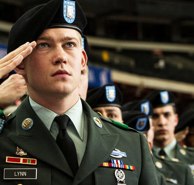 Joe Alwyn (Billy), Garrett Hedlund (Dime), Arturo Castro (Mango), Mason Lee (Foo), Brian " Astro " Bradley (Lodis), Beau Knapp (Crack), Ismael Cruz Cordova (Holliday), Barney Harris (Sykes), Vin Diesel (Shroom), Steve Martin (Norm), Chris Tucker (Albert), Kristen Stewart (Kathryn), Makenzie Leigh (Faison), Ben Platt (Josh), Bruce McKinnon (le père de Billy), Deirdre Lovejoy (la mère de Billy), Laura Lundy Wheale (Patty Lynn), Allen Daniel (Major Mac), Randy Gonzalez (Hector), Tim Blake Nelson (Wayne), Tommy McNulty (un reporter), Markina Brown (un reporter), Eric Kan (un reporter), Dana Barrett (un reporter), Richard Sherman (un footballeur), J.J. Watt (un footballeur), Christopher Cook (le contremaitre des techniciens), Currin McLamb (un neveu de Billy), Lee McLamb (un neveu de Billy), Austin McLamb (un neveu de Billy), Matthew Barnes (Travis), Kristin Erickson (la petite amie de Travis), Brad Mills (l'ami de Travis), Genevieve Adams (la régisseuse), David Ramsey (le gestionnaire), Matthew Brady (le vigile du stade), Katrina Pettiford (Kelly), Erin Moore (Michelle), Elizabeth Chestang (Beyoncé), Kellie Pickler (la chanteuse de l'hymne national), Marc Inniss (le chanteur de la mi-temps), Fajer Kaisi (l'interprète)