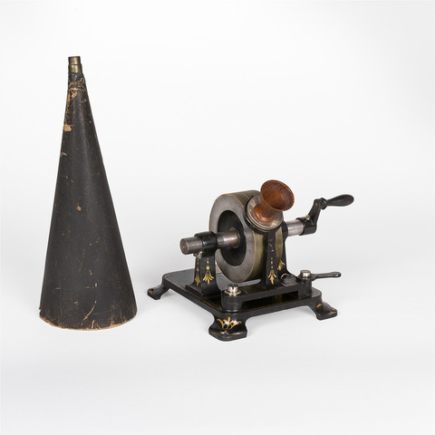 phonographe enregistreur et diffuseur ; roue portant à l'origine une feuille d'étain ; diaphragme graveur et lecteur monté sur tête mobile ; manivelle en bois ; base en fonte