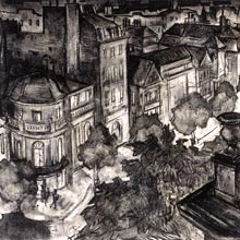 Maquette de décor constituée d'un dessin au fusain sur carton, représentant des immeubles, pour le film Les Misérables, de Jean-Paul Le Chanois (1957) Serge Pimenoff / Collections Cinémathèque française |